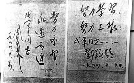 周恩来翻看了成军在小本本上记的读书笔记后,提起毛笔在上面写下“努力学习,永远前进!”。写完后,他把笔递给邓大姐说,“来,你也给小成写句话嘛”。邓大姐接过笔,在另一页纸上写下了“努力学习!努力工作!”。