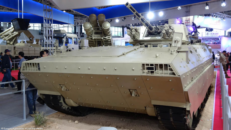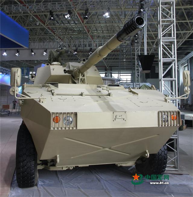 此次展出的ST1型轮式突击炮,又得大名“坦克歼击车”。它的特点是身兼多种作战功能、威力大、机动性强,在本次航展采用沙漠色涂装。