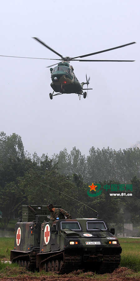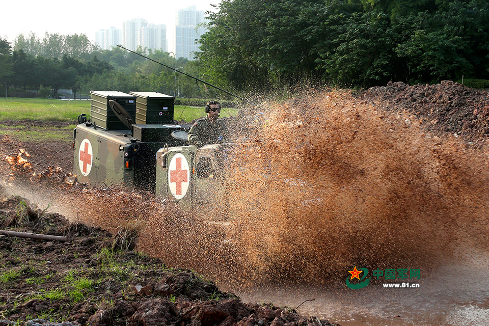 德方参演的一辆全地形履带式双节装甲救护车通过水坑。中国军网记者李三红 摄