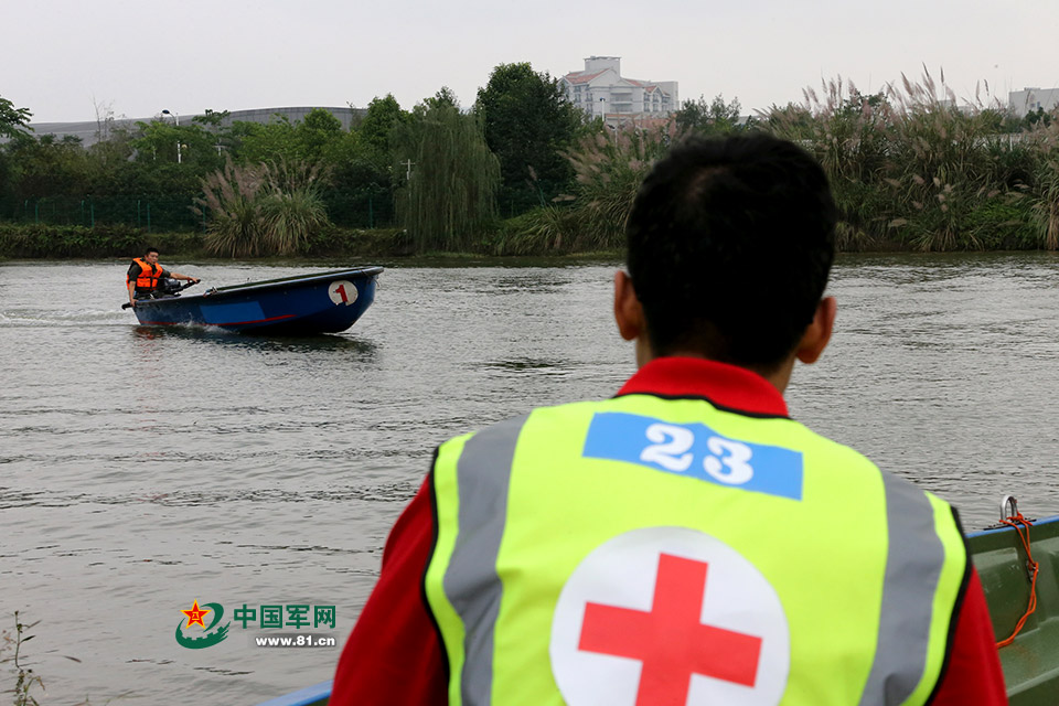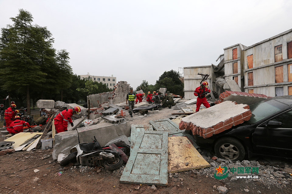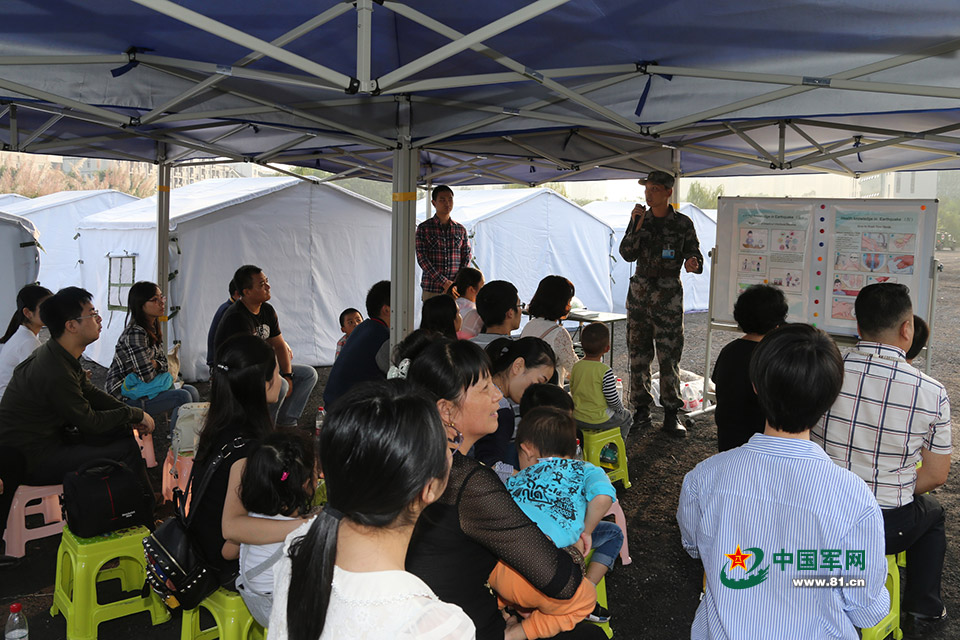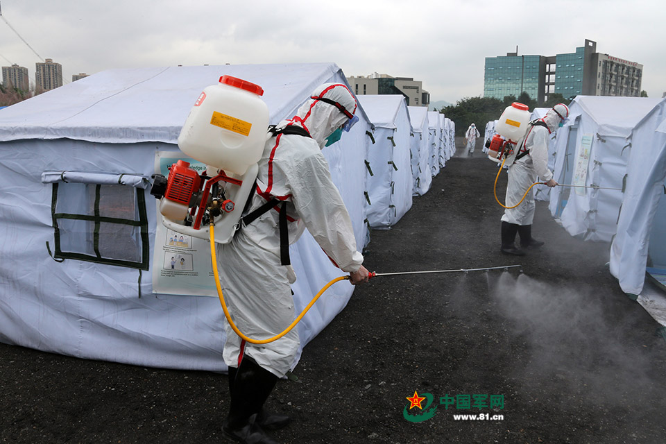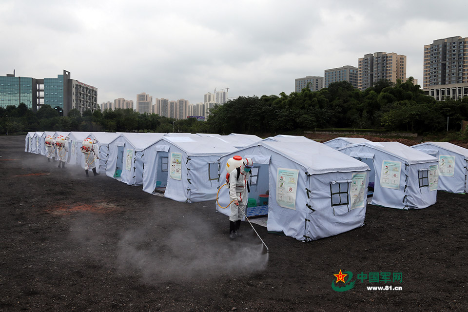 卫生防疫人员在对“受灾群众”集中安置点进行消杀灭作业。中国军网记者 李三红 摄