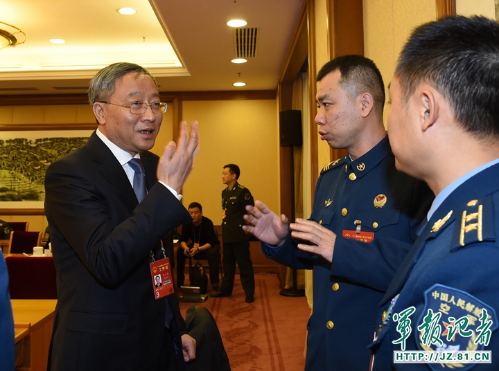 3月5日,解放军代表团小组审议政府工作报告。图为会议间隙,国家财政部副部长张少春向军队人大代表解答士官退伍安置等问题。记者冯凯旋摄