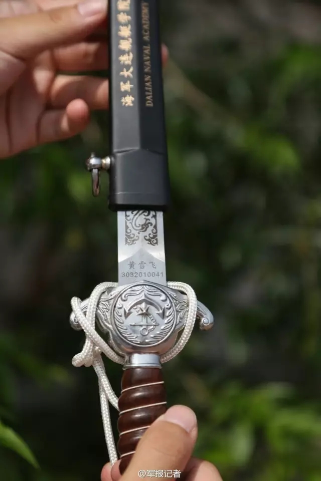 佩剑专门设计定制而成,剑格上刻有海军锚与浪花,凸显海军特色。这是一把钛钢佩剑,剑柄为红木金属丝缠绕装饰,锋刃上镌刻着学员名字和学号。