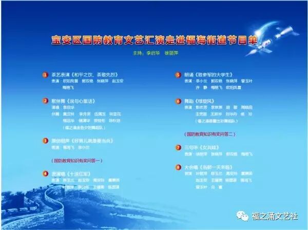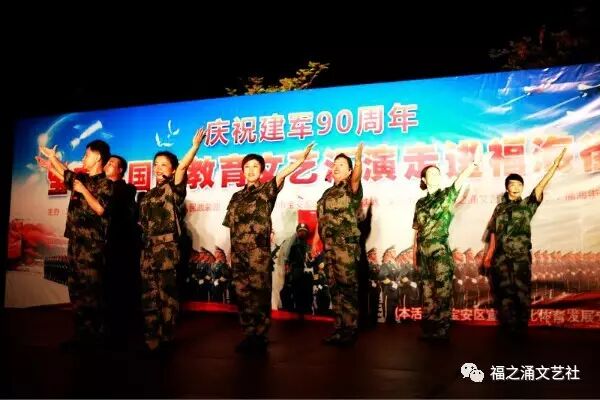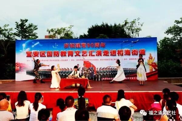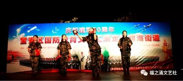 福之涌文艺社打造的原创国防教育节目舞蹈《绿旋风》、茶艺和平之饮、茶敬先烈》、相声《好男儿就是要当兵》、三句半《女兵娃》、朗诵《致参军的大学生》一一亮相,惊艳全场。这些完全由生活在福永、福海的民间文艺爱好者历时3个多月精心排练打造的节目寓教于乐,让观众增强了国防观念,掌握一些基本的国防知识。