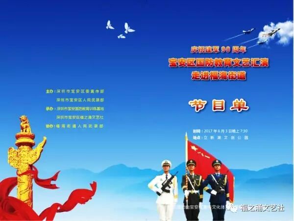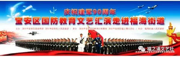 该活动由深圳市宝安区委宣传部、宝安区人民武装部主办,宝安国防教育训练基地、宝安区福之涌文艺社承办、福海街道人民武装部协办,由宝安区宣传文化体育发展专项资金资助。
